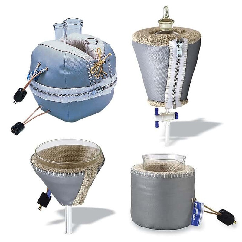 B. 球形加热套可从头到尾完全覆盖单颈、双颈或三颈球形烧瓶。加热套由柔性织物制成,可有效加热并保护玻璃容器。环绕拉链可使两半加热套严丝合缝地保持在一起,以防热量散失。加热套可从顶部打开,而不会干扰玻璃容器。